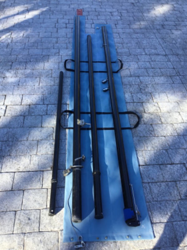 Included with the sailboat: trailer and separate dolly, 2 full original sails, extra mast and boom, extra rudder, 2 extra centerboards, 2 extra travelers, extra rigging and battens, spare hardware, 2 West Marine flotation vests and canisters, compass, collapsible paddle, flares, original brochure and book, gloves, and more not shown in photos.